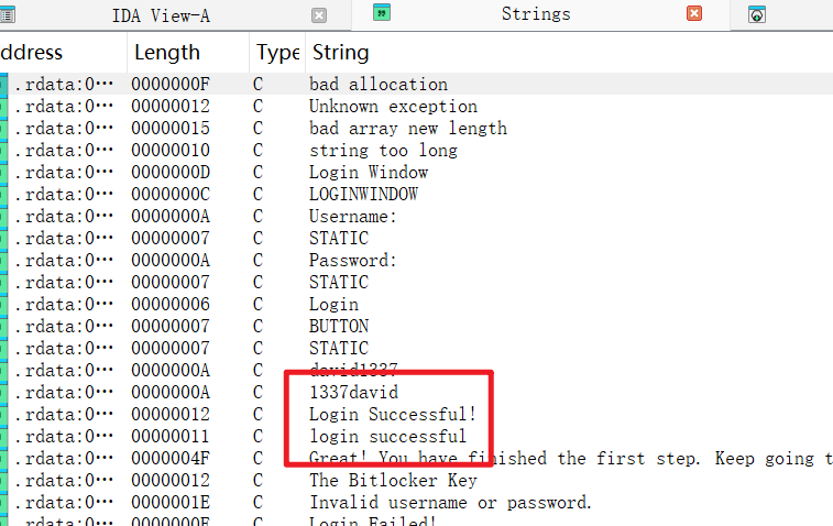 [单选题] 在 U盘中,你还发现了一个exe文件,但它被锁定,可能需要进行反编译以便进一步检查。 参考David_USB_8GB.e01,使用x64dbg的字符串搜索(String Search)功能,在Bitlocker.exe中查找哪个字符串最有可能与显示的登录状态有关?