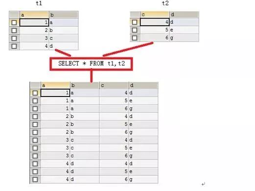 连接查询会产生笛卡尔积,假设集合A={a,b},集合B={0,1,2},则两个集合的笛卡尔积为{(a,0),(a,1),(a,2),(b,0),(b,1),(b,2)}。可以扩展到多个集合的情况。