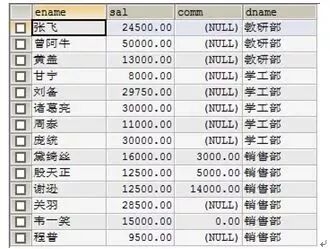 其中deptno为50,而在dept表中只有10、20、30、40部门,那么上面的查询结果中就不会出现“张三”这条记录,因为它不能满足e.deptno=d.deptno这个条件。