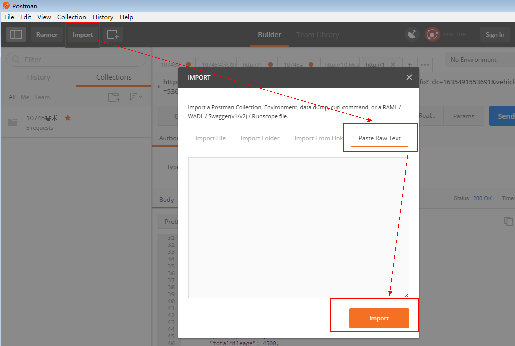 复制后打开postman--Import----选择Paste Raw Text----复制----点击Import,直接send即可查看接口的回复,找到此字段可判断问题。