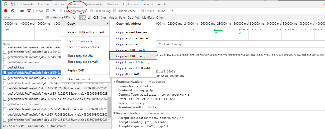 前端显示数据不正确,此时就需要复制接口查看是前段还是后端问题,找到此接口请求,右键Copy---Copy as cURL(bash)。