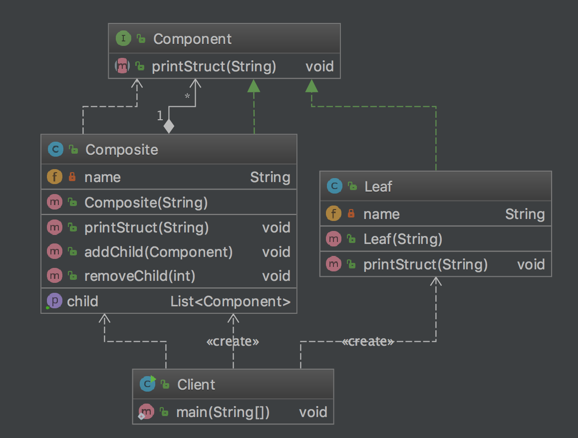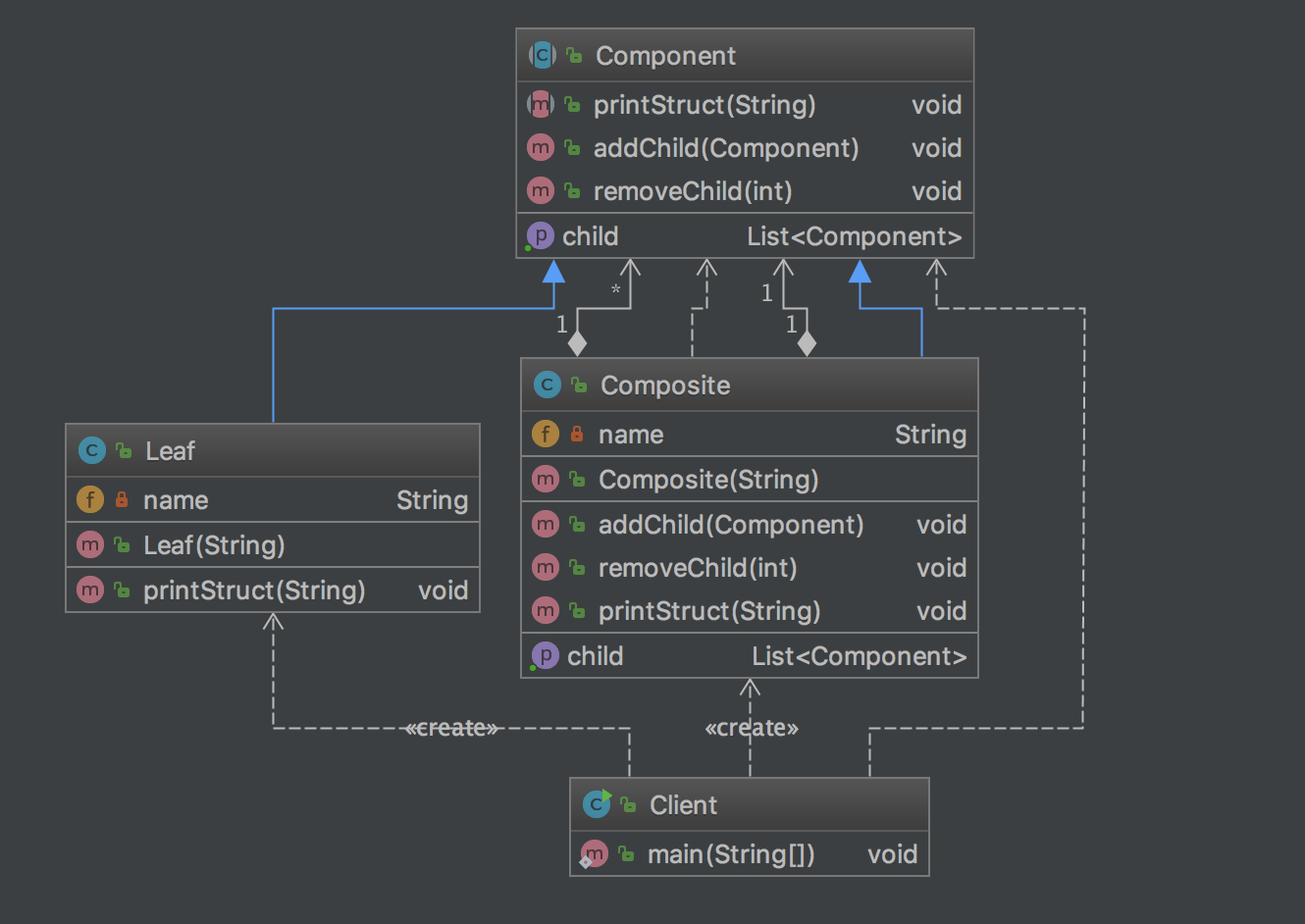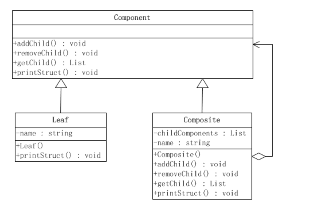这里所说的透明性组合模式是指:从客户端使用合成模式上,是否需要区分到底是“树枝对象”还是“树叶对象”。如果是透明的,那就不用区分,对于客户而言,都是Compoent对象,具体的类型对于客户端而言是透明的,是无须关心的。
