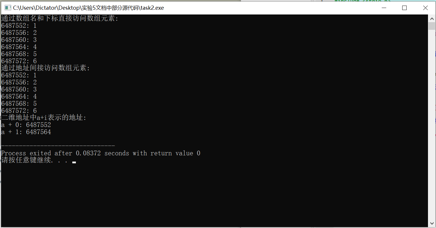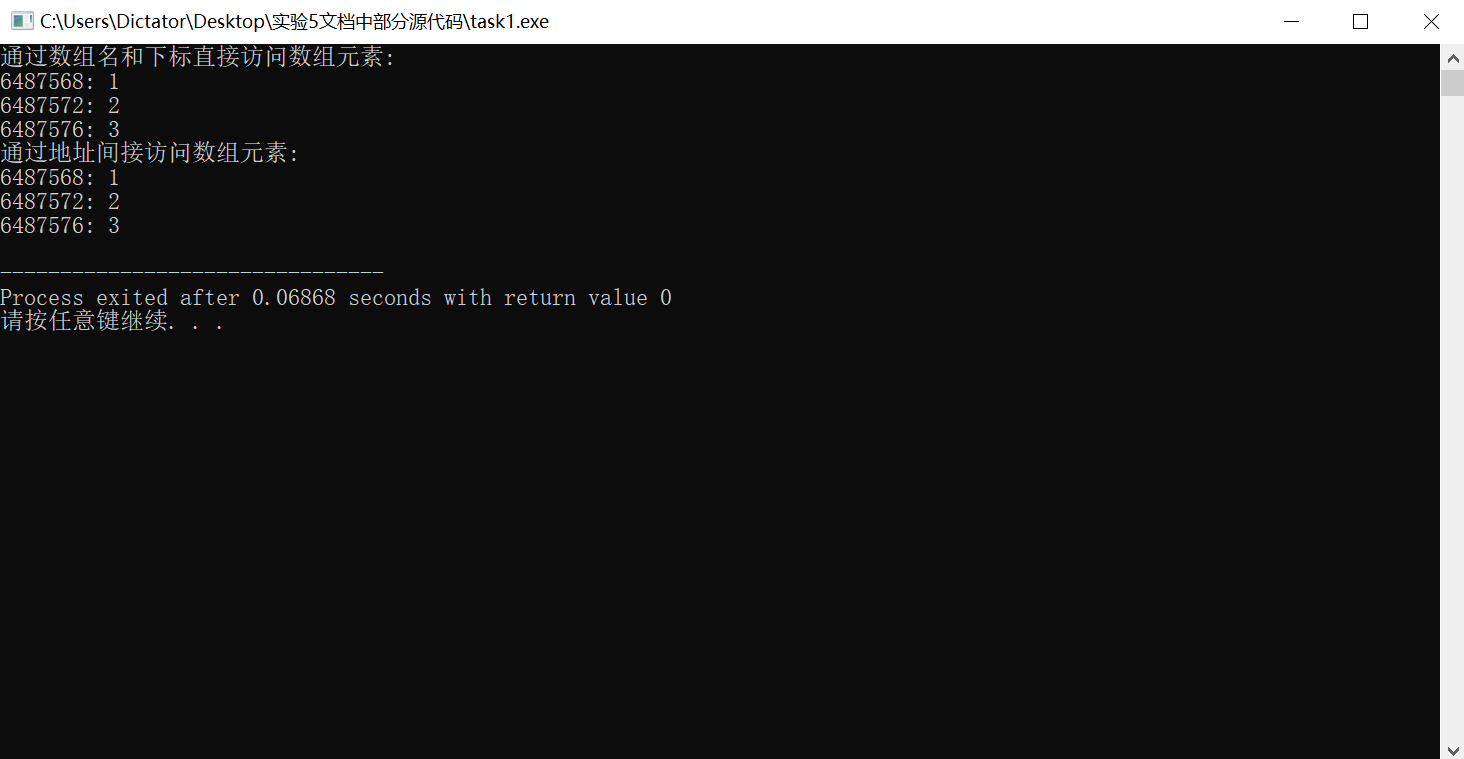 #include <stdio.h> const int N=3; int main() { int a[N] = {1, 2, 3}; int i; printf("通过数组名和下标直接访问数组元素:\n"); for(i=0; i<N; i++) printf("%d: %d\n", &a[i], a[i]); printf("通过地址间接访问数组元素:\n"); for(i=0; i<N; i++) printf("%d: %d\n", a+i, *(a+i)); return 0; }