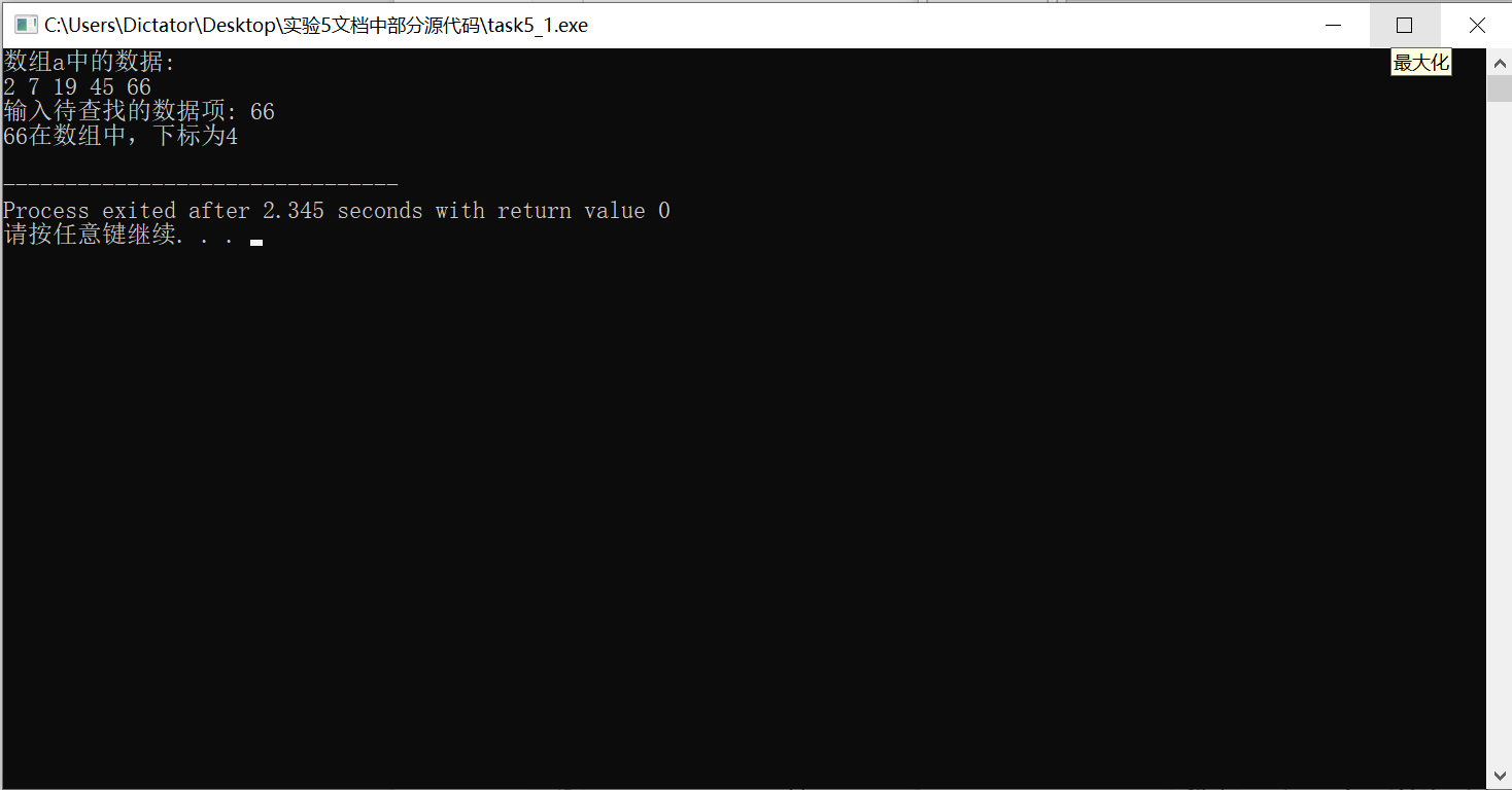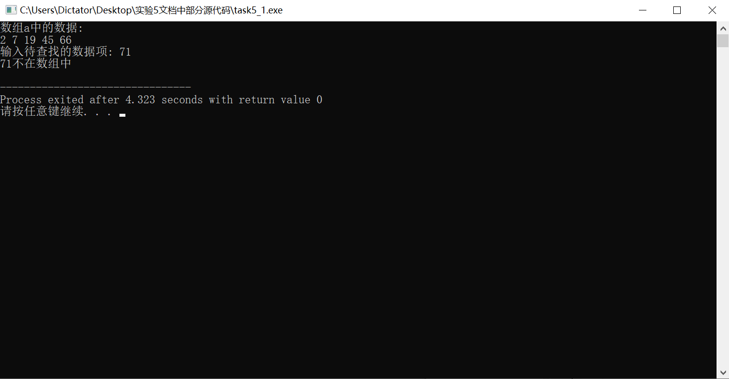 #include <stdio.h> const int N=5; int binarySearch(int *x, int n, int item); // 函数声明 int main() { int a[N]={2,7,19,45,66}; int i,index, key; printf("数组a中的数据:\n"); for(i=0;i<N;i++) printf("%d ",a[i]); printf("\n"); printf("输入待查找的数据项: "); scanf("%d", &key); // 调用函数binarySearch()在数组a中查找指定数据项key,并返回查找结果给index index=binarySearch(a,N,key);//补足的代码 if(index>=0) printf("%d在数组中,下标为%d\n", key, index); else printf("%d不在数组中\n", key); return 0; } //函数功能描述: //使用二分查找算法在从x中查找特定值item,数组x大小为n // 如果找到,返回其下标 // 如果没找到,返回-1 int binarySearch(int *x, int n, int item) { int low, high, mid; low = 0; high = n-1; while(low <= high) { mid = (low+high)/2; if ( item == *(x+mid) ) return mid ; //补足的代码 else if(item < *(x+mid)) high=mid-1; //补足的代码 else low=mid+1; //补足的代码 } return -1; }