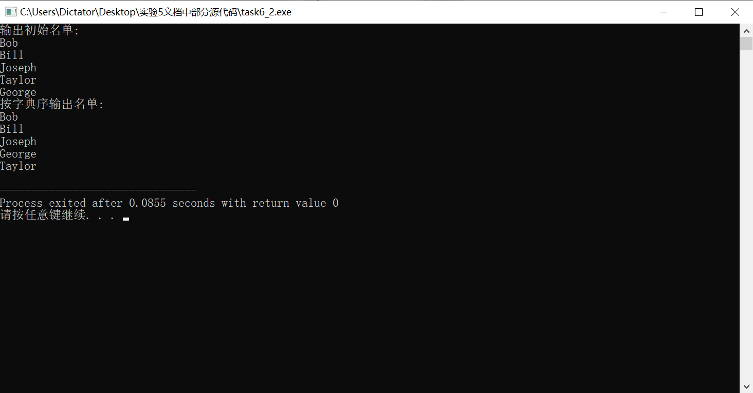 #include <stdio.h> #include<string.h> const int N = 5; void selectSort(char str[][20], int n ); // 函数声明,形参str是二维数组名 int main() { char name[][20] = {"Bob", "Bill", "Joseph", "Taylor", "George"}; int i; printf("输出初始名单:\n"); for(i=0; i<N; i++) printf("%s\n", name[i]); selectSort(name, N); // 调用选择法对name数组中的字符串排序 printf("按字典序输出名单:\n"); for(i=0; i<N; i++) printf("%s\n", name[i]); return 0; } // 函数定义 // 函数功能描述:使用选择法对二维数组str中的n个字符串按字典序排序 void selectSort(char str[][20], int n) { int i,j,k; char temp[20]; for(i=0;i<n-1;i++) k=i; for(j=i+1;j<n;j++) if(strcmp(str[j],str[k])<0) k=j; if(k!=i){ strcpy(temp,str[k]); strcpy(str[k],str[i]); strcpy(str[i],temp);} }