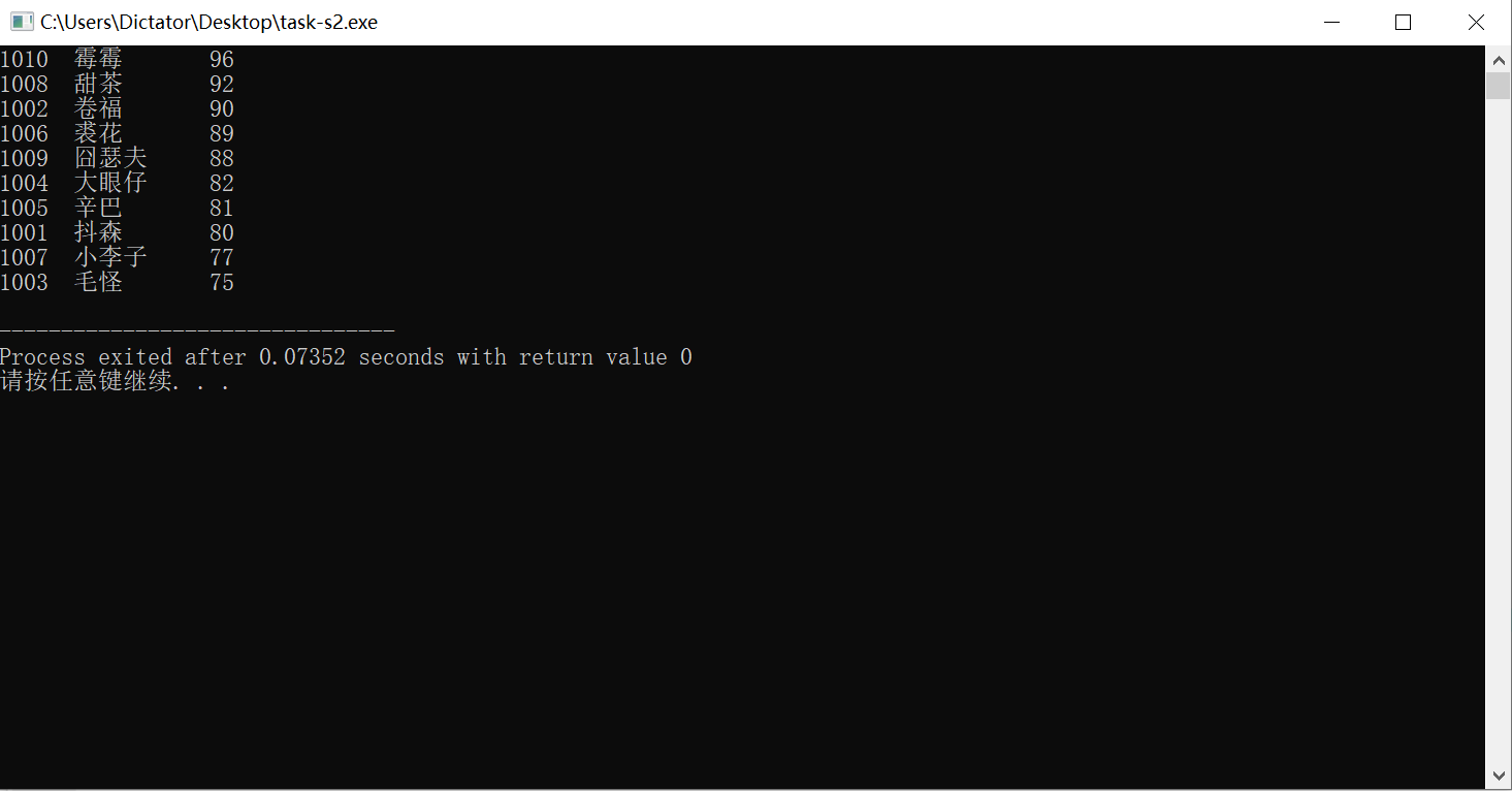 运行程序,屏幕上正确输出了按分数由高到底排序的学生信息;