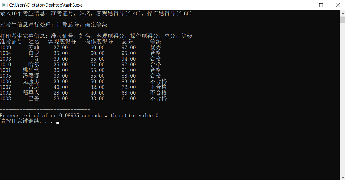 printf("\n打印考生完整信息: 准考证号,姓名,客观题得分,操作题得分,总分,等级\n");