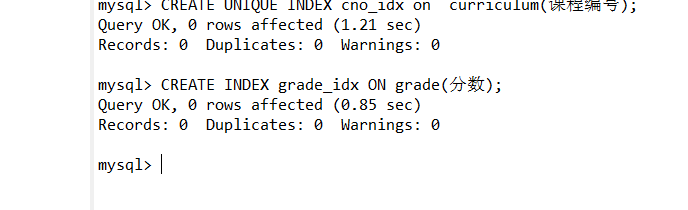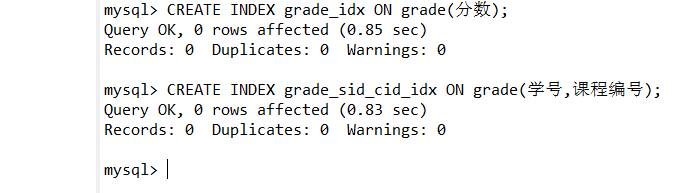 3.使用SQL语句为grade表的“分数”字段创建一个普通索引,命名为grade_idx。