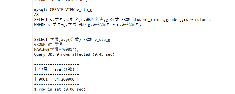 8.基于student_info表、curriculum表和grade表,建立一个名为v_stu_g的视图,视图包括所有学生的学号、姓名、课程名称、分数。使用视图v_stu_g查询学号为0001的学生的课程平均分。