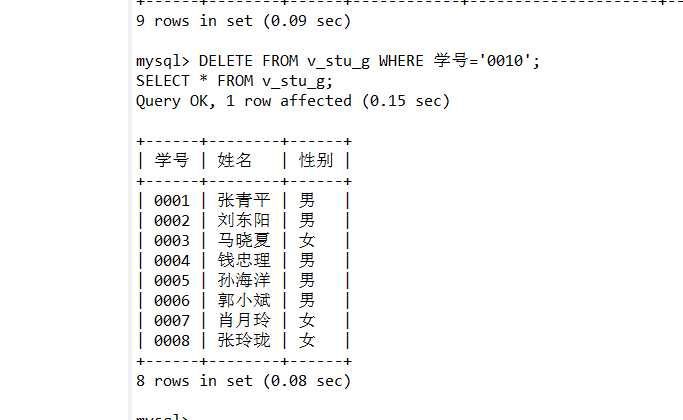 11.利用视图v_stu_g删除学号为0010的学生记录。