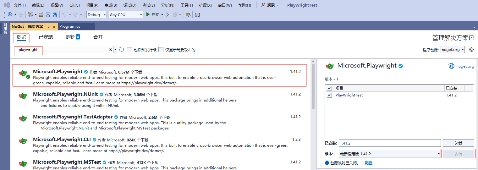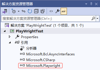 选择Microsoft.Playwright进行安装(只安装这一个包,其他的不安装),安装成功后项目引用中出现Microsoft.Playwright