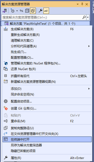 解决方案资源管理器中右键解决方案名称选择在终端中打开