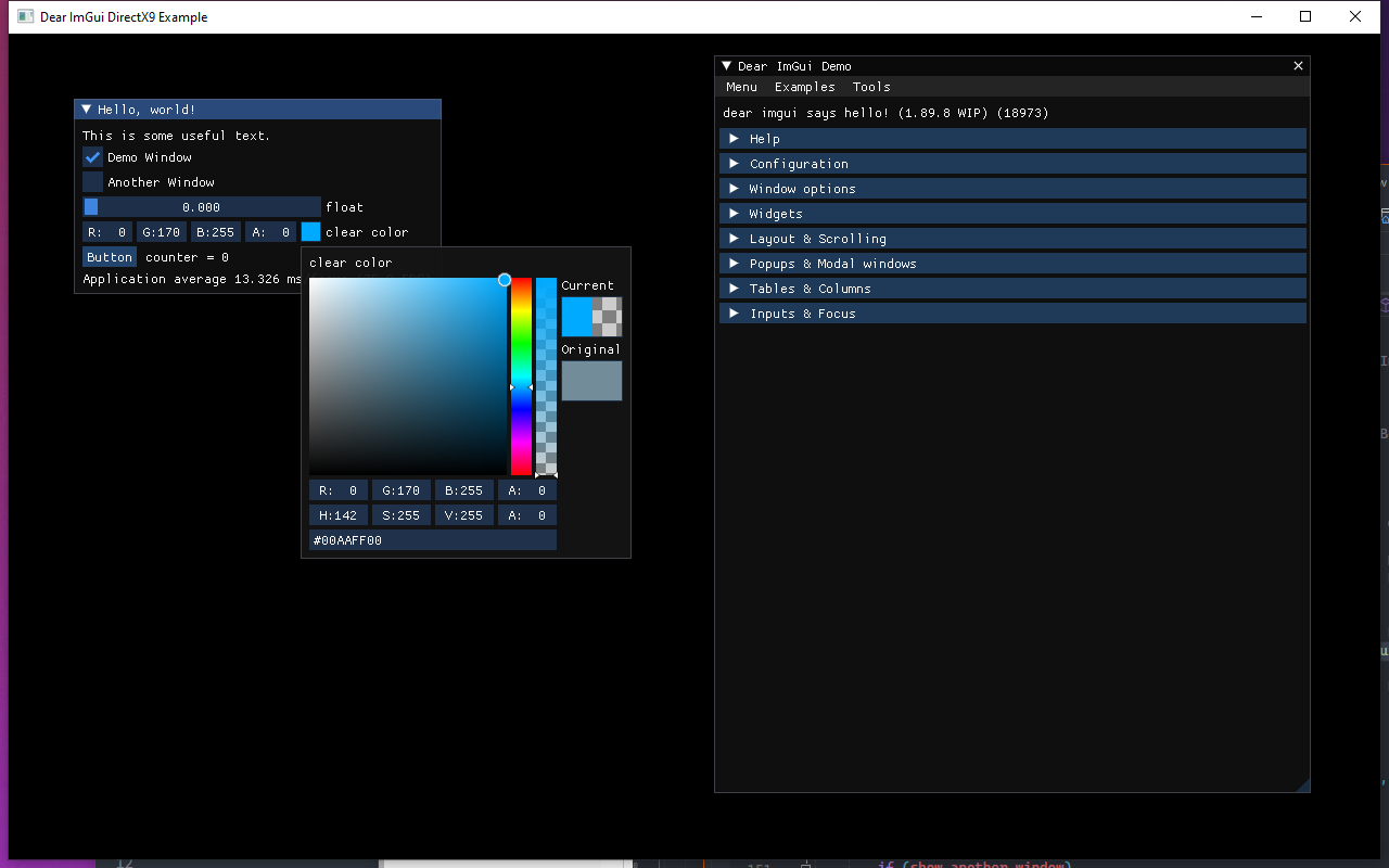 // Main code int main(int, char**) { // Create application window //ImGui_ImplWin32_EnableDpiAwareness(); WNDCLASSEXW wc = { sizeof(wc), CS_CLASSDC, WndProc, 0L, 0L, GetModuleHandle(nullptr), nullptr, nullptr, nullptr, nullptr, L"ImGui Example", nullptr }; ::RegisterClassExW(&wc); HWND hwnd = ::CreateWindowW(wc.lpszClassName, L"Dear ImGui DirectX9 Example", WS_OVERLAPPEDWINDOW, 100, 100, 1280, 800, nullptr, nullptr, wc.hInstance, nullptr); ImGui_ImplWin32_EnableAlphaCompositing(hwnd);