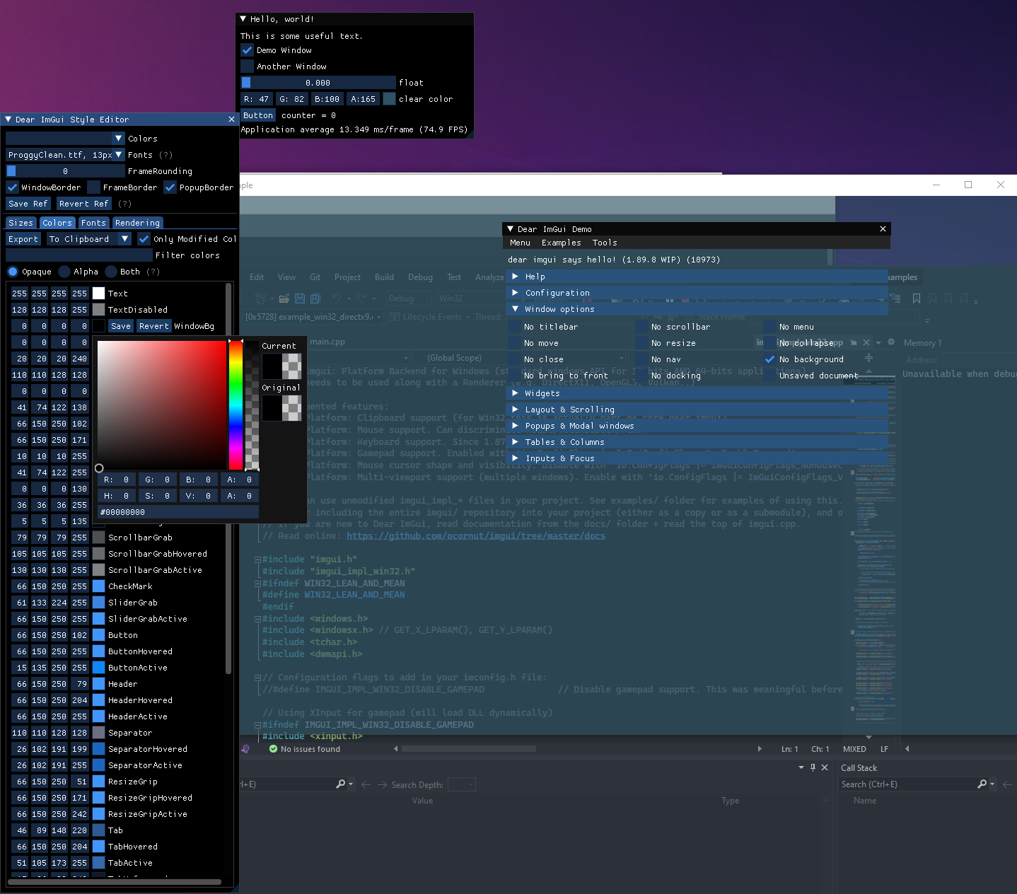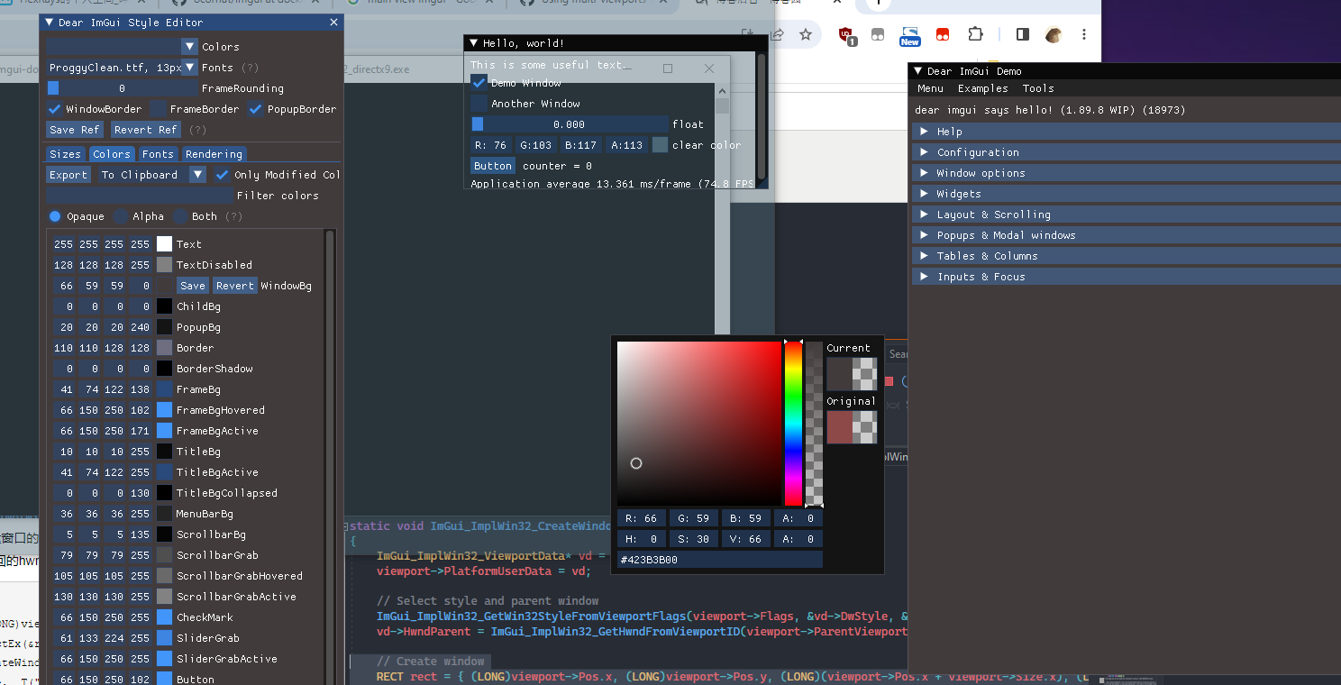 IMGUI 分主窗口和主窗口下的各种其它窗口,也就是main view窗口,这个窗口是正常win32样式,运行官方的例子可以更改主窗口的背景色