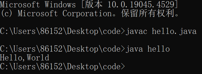 - 编译该文件,控制台中进入该目录下,执行 javac hello.java