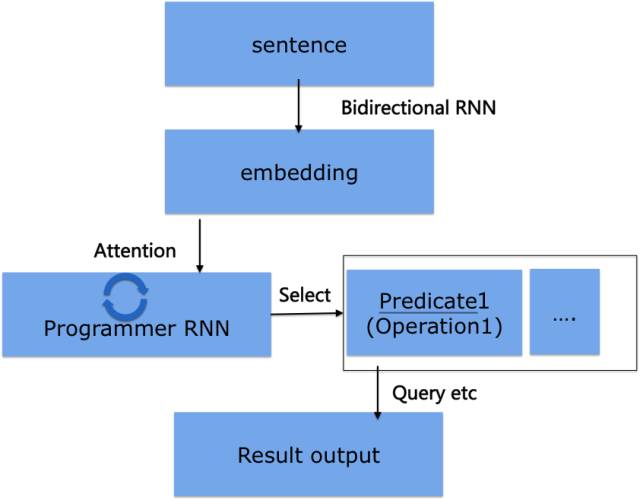 在分布式表示转换为逻辑表达式的过程中,我们首先面临表示和谓词逻辑(predicate)操作之间映射的问题。我们把谓词当做动作,通过训练执行symbolicoperation,类似neural programmer中利用attention机制选择合适的操作,即选择最有可能的谓词操作,最后根据分析的句法等把谓词操作拼接为可能的逻辑表达式,再把逻辑表达式转换为查询等。过程示意如下图所示。