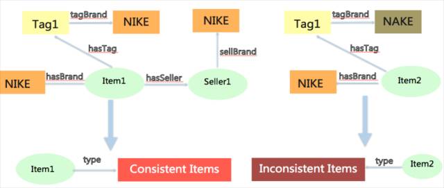2. 不一致推理。在与问题卖家对弈过程中,我们需要对商品标题、属性、图片、商品资质、卖家资质中的品牌、材质、成分等基础信息,做一致性校验。比如说标题中的品牌是Nike而属性或者吊牌中品牌是Nake,如下图所示,左边描述了商品标题、属性、吊牌上的品牌信息是一致的,推理为一致。右边为吊牌和商品品牌不一致的商品,被推理引擎判断为有问题的商品。