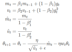 其中是学习率,第二个方程中的第三项是解耦权重衰减。同样,对于带权重衰减的Adam算法(AdamW),我们得到:
