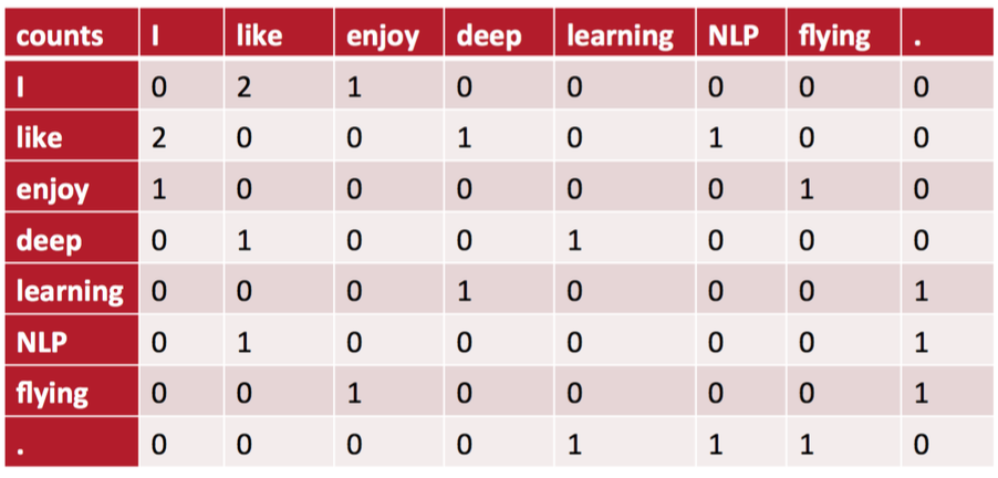 作为示例,我们设定的窗口大小为1,也就是只看某个单词周围紧邻着的那个单词。此时,将得到一个对称矩阵——共现矩阵。因为在我们的语料库中,I 和 like做为邻居同时出现在窗口中的次数是2,所以下表中I 和like相交的位置其值就是2。这样我们也实现了将word变成向量的设想,在共现矩阵每一行(或每一列)都是对应单词的一个向量表示。