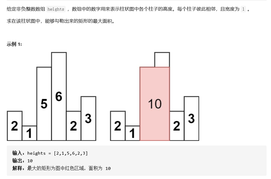 class Solution { public int largestRectangleArea(int[] heights) { int maxare = 0; Deque<Integer> sta = new LinkedList<>(); sta.addLast(-1); for(int i = 0;i < heights.length; i++){ while(sta.peekLast() != -1 && heights[sta.peekLast()] > heights[i]){ // int index = sta.pollLast(); int height = heights[sta.pollLast()]; maxare = Math.max(maxare,height*(i-sta.peekLast()-1)); } sta.addLast(i); } while(sta.peekLast() != -1){ int height = heights[sta.pollLast()]; maxare = Math.max(maxare,height * (heights.length - sta.peekLast()-1)); } return maxare; } }