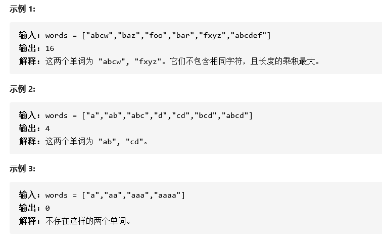给定一个字符串数组 words,请计算当两个字符串 words[i] 和 words[j] 不包含相同字符时,它们长度的乘积的最大值。假设字符串中只包含英语的小写字母。如果没有不包含相同字符的一对字符串,返回 0。
