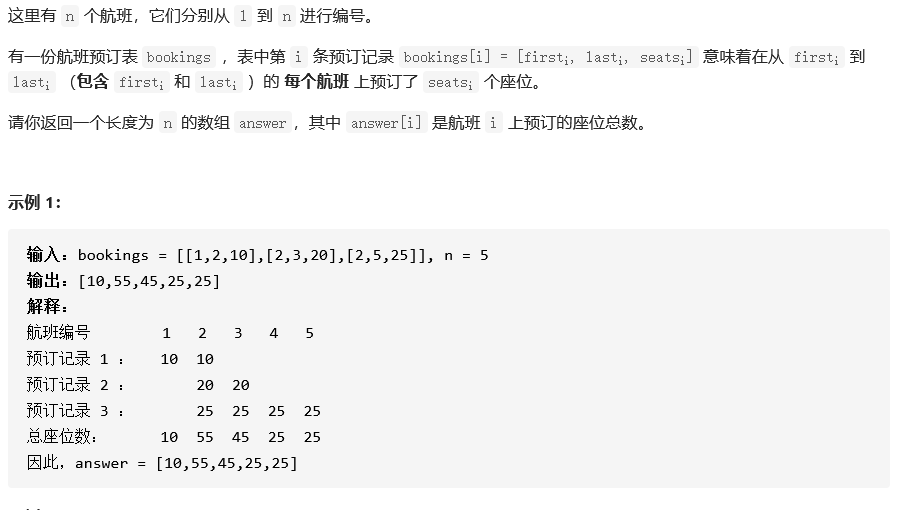 class Solution { public int[] corpFlightBookings(int[][] bookings, int n) { int[] nums = new int[n]; for(int[] booking:bookings){ nums[booking[0]-1] += booking[2]; if(booking[1] < n){ nums[booking[1]] -= booking[2]; } } for(int i = 1;i < n; i++){ nums[i] += nums[i-1]; } return nums; } }