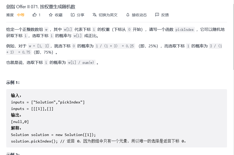 class Solution { int[] w; public Solution(int[] w) { for(int i = 1; i < w.length ; i++){ w[i] += w[i-1]; } this.w = w; } public int pickIndex() { int target = new Random().nextInt(w[w.length-1])+1; int left = 0; int right = this.w.length-1; while(left < right){ int mid = (left+right)/2; if(this.w[mid] < target){ left = mid+1; }else{ right = mid; } } return right; } }