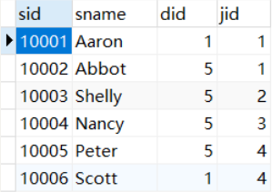 CREATE TABLE `staff` ( `sid` int(11) NOT NULL COMMENT '职工号\r\n', `sname` varchar(255) DEFAULT NULL COMMENT '职工名', `did` int(11) DEFAULT NULL COMMENT '部门号', `jid` int(11) DEFAULT NULL COMMENT '职位号', PRIMARY KEY (`sid`), KEY `did` (`did`), KEY `jid` (`jid`), CONSTRAINT `did` FOREIGN KEY (`did`) REFERENCES `department` (`did`), CONSTRAINT `jid` FOREIGN KEY (`jid`) REFERENCES `job` (`jid`) ) ENGINE=InnoDB DEFAULT CHARSET=utf8mb4 COLLATE=utf8mb4_0900_ai_ci;