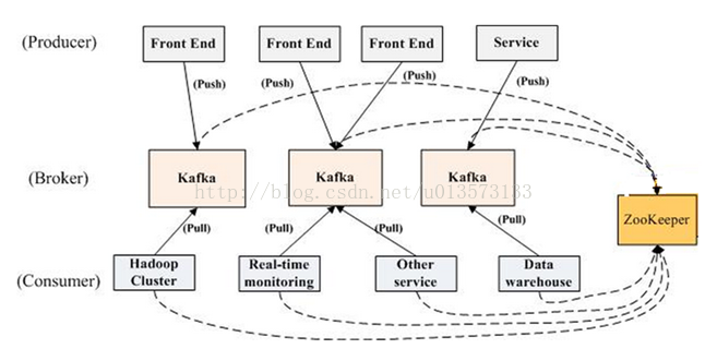 push-and-pull : Kafka中的Producer和consumer采用的是push-and-pull模式,即Producer只管向broker push消息,consumer只管从broker pull消息,两者对消息的生产和消费是异步的。