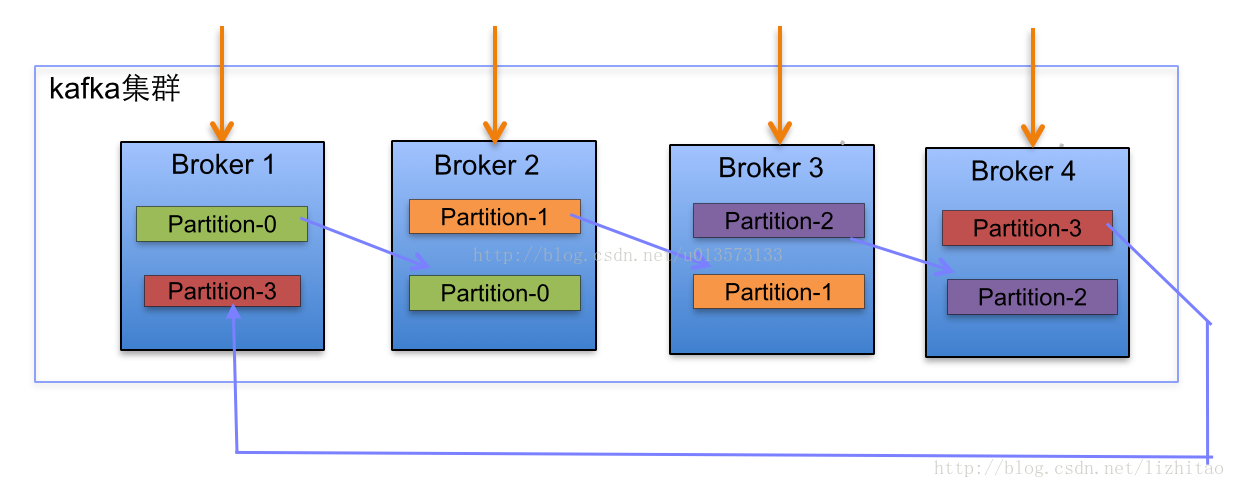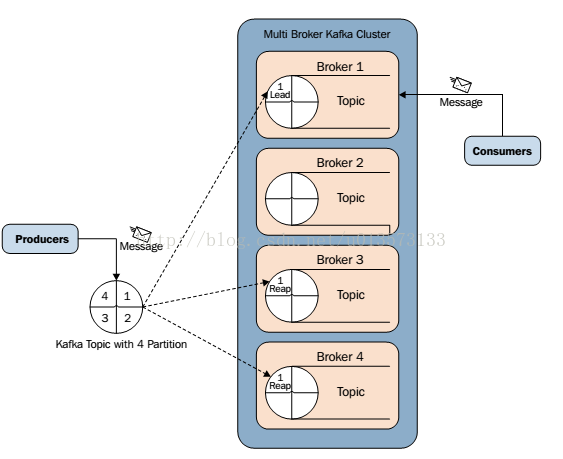 下面以一个Kafka集群中4个Broker举例,创建1个topic包含4个Partition,2 Replication;数据Producer流动如图所示:
