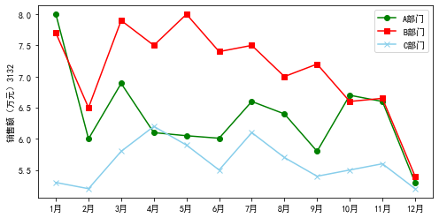 plt.plot(data['月份'],data['C部门'],color='skyblue',label='C部门',marker='x')