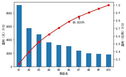 贡献度分析,对于一个企业来说有80%的利润来于20%的商品剩下20%的利润只产生余下80%的产品。例如上图我们应加大A1~A7的成本投入减少A8~A10的投入来提高利润。