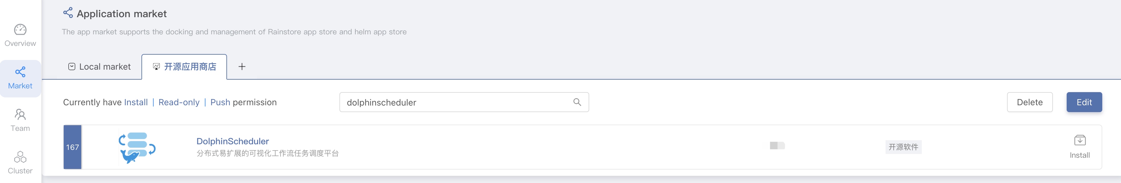 - 进入 Rainbond 的平台管理 -> 应用市场 -> 开源应用商店中搜索 dolphinscheduler 即可找到 DolphinScheduler 应用。