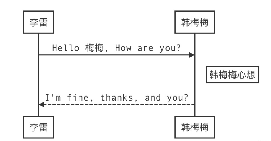李雷 -> 韩梅梅: Hello 梅梅, How are you? Note right of 韩梅梅: 韩梅梅心想 韩梅梅 --> 李雷: I'm fine, thanks, and you?