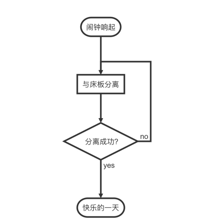 st=>start: 闹钟响起 op=>operation: 与床板分离 cond=>condition: 分离成功? e=>end: 快乐的一天 st->op->cond cond(yes)->e cond(no)->op