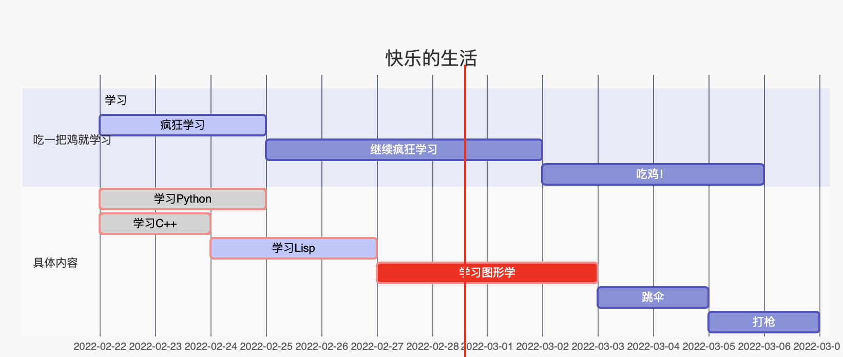 gantt dateFormat YYYY-MM-DD title 快乐的生活 section 吃一把鸡就学习 学习 :done, des1, 2022-02-22,2022-02-22 疯狂学习 :active, des2, 2022-02-22, 3d 继续疯狂学习 : des3, after des2, 5d 吃鸡! : des4, after des3, 4d section 具体内容 学习Python :crit, done, 2022-02-22,72h 学习C++ :crit, done, after des1, 2d 学习Lisp :crit, active, 3d 学习图形学 :crit, 4d 跳伞 :2d 打枪 :2d