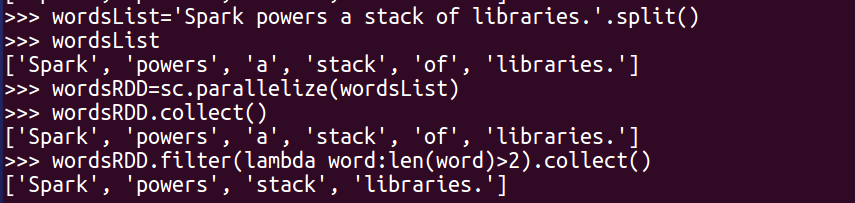 wordsRDD.filter(lambda word:len(word)>2).collect()