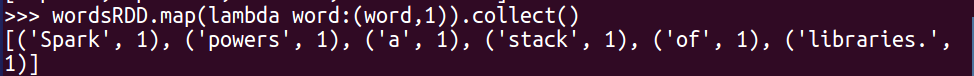 3.筛选出的单词RDD,映射为(单词,1)键值对。 words.map()