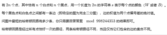 // ubsan: undefined // accoders #include <bits/stdc++.h> using namespace std; #define int long long typedef long long ll; const int N = 1e7 + 666; const int mod = 998244353; int w, b, T, n; ll f[N]; char c; signed main() { freopen("path.in", "r", stdin); freopen("path.out", "w", stdout); cin >> T; while (T--) { cin >> n; n <<= 1; w = 0; b = 0; f[0] = 1; /*for(int i=1;i<=1;i++){ cin>>c; if(c=='W') w++; else b++; }*/ f[0] = 1; for (int i = 1; i <= n; i++) { cin >> c; if (w == b) { f[i] = f[i - 1]; } else if ((c == 'W') == (w > b)) f[i] = f[i - 1]; else if (w == b + 1 || b == w + 1) { f[i] = f[i - 1] * 2 % mod; } else if (w > b) { if (c == 'W') f[i] = f[i - 1]; else f[i] = f[i - 1] * (w - b) % mod * (w - b - 1) % mod; } else { if (c == 'B') f[i] = f[i - 1]; else f[i] = f[i - 1] * (b - w) % mod * (b - w - 1) % mod; } if (c == 'W') w++; else b++; // cout<<i<<" "<<w<<" "<<b<<" "<<f[i]<<endl; } // cout<<f[n]*2%mod<<endl; // cout<<f[n]<<" "; printf("%lld\n", 1ll * f[n] * (mod / 2 + 1) % mod * (mod / 2 + 1) % mod); } return 0; }