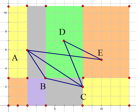 假设A为可以直接与B相遇且速度最小的点,C为可以直接与B相遇且速度最大的点,那么,对于灰色区域的任意一点,我们可以让他直接与B相遇,完成直接染色;对于紫色区域的任意一点M,我们都可以让B先与A相遇,A与M再相遇,从而完成间接染色。对于绿色区域的任意一点M,我们都可以让B先与C相遇,C再与M相遇,完成间接染色。对于黄色区域,因为AC已经是速度最大或最小的能直接相遇的点,所以黄色区域里没有点;对于橙色区域中的点,既不能直接与B相遇,又不能找到中继完成间接相遇,因此无法被染色。综上,如果B点被染色,那么紫色,绿色,灰色内的点一定会被直接或间接染色,也就是说,对于速度在A,C之间的多有点,一定会被染色,而其他点一定不会被染色。