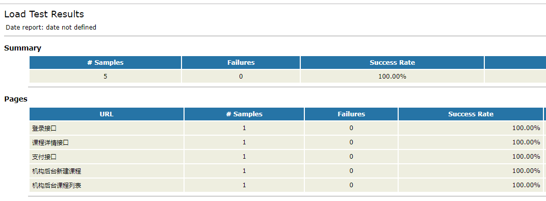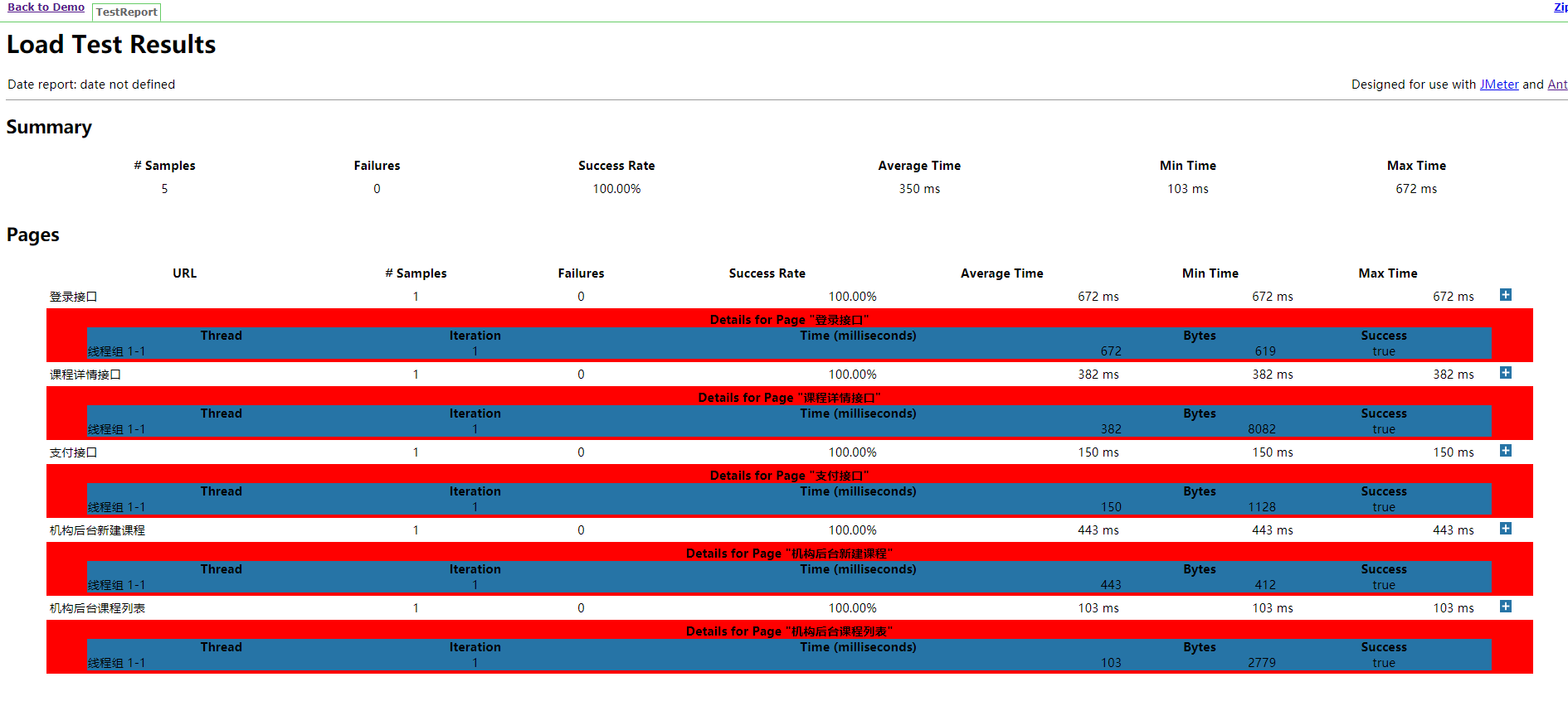 <?xml version="1.0" encoding="UTF-8"?> <project name="ant-jmeter-test" default="run" basedir="."> <tstamp> <format property="time" pattern="yyyyMMddhhmm" /> </tstamp> <!-- 需要改成自己本地的 Jmeter 目录--> <property name="jmeter.home" value="\home\app\apache-jmeter-5.1.1" /> <!-- jmeter生成jtl格式的结果报告的路径--> <property name="jmeter.result.jtl.dir" value="\home\app\report\jtl" /> <!-- jmeter生成html格式的结果报告的路径--> <property name="jmeter.result.html.dir" value="\home\app\report\html" /> <!-- 生成的报告的前缀--> <property name="ReportName" value="TestReport" /> <property name="jmeter.result.jtlName" value="${jmeter.result.jtl.dir}/${ReportName}${time}.jtl" /> <property name="jmeter.result.htmlName" value="${jmeter.result.html.dir}/${ReportName}.html" /> <target name="run"> <antcall target="test" /> <antcall target="report" /> </target> <target name="test"> <taskdef name="jmeter" classname="org.programmerplanet.ant.taskdefs.jmeter.JMeterTask" /> <jmeter jmeterhome="${jmeter.home}" resultlog="${jmeter.result.jtlName}"> <!-- 声明要运行的脚本。"*.jmx"指包含此目录下的所有jmeter脚本--> <testplans dir="\home\app\report\" includes="*.jmx" /> <property name="jmeter.save.saveservice.output_format" value="xml"/> </jmeter> </target> <path id="xslt.classpath"> <fileset dir="${jmeter.home}/lib" includes="xalan*.jar"/> <fileset dir="${jmeter.home}/lib" includes="serializer*.jar"/> </path> <target name="report"> <tstamp> <format property="report.datestamp" pattern="yyyy/MM/dd HH:mm" /></tstamp> <xslt classpathref="xslt.classpath" force="true" in="${jmeter.result.jtlName}" out="${jmeter.result.htmlName}" style="${jmeter.home}/extras/jmeter-results-detail-report_21.xsl" /> <!-- 因为上面生成报告的时候,不会将相关的图片也一起拷贝至目标目录,所以,需要手动拷贝 --> <copy todir="${jmeter.result.html.dir}"> <fileset dir="${jmeter.home}/extras"> <include name="collapse.png" /> <include name="expand.png" /> </fileset> </copy> </target> </project>