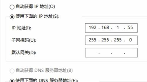 在“IP地址”和“子网掩码”中分别输入“192.168.1.55”(此地址最后一个字段可以自由设置)和“255.255.255.0”。