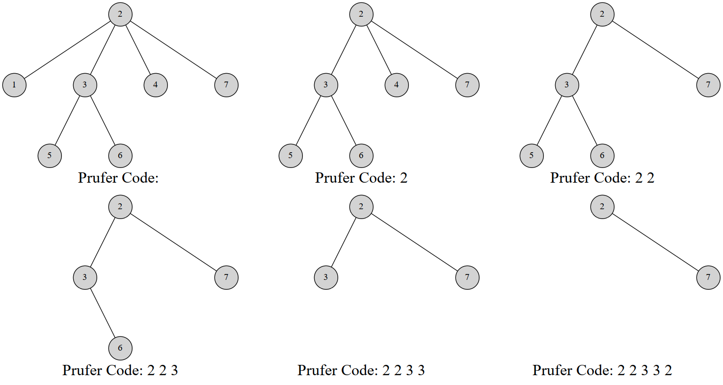 依次考虑 Prüfer 序列 \(p\) 中的每一个元素,假设当前考虑到第 \(i\) 个元素 \(p_i\),不难发现未被标记的编号最小的叶子节点是好确定的。在未被标记的节点中,编号最小的不在 \(p[i:n]\) 中出现的节点 \(x\) 就是当前未被标记的编号最小的叶子节点,将 \(x\) 标记为叶子节点。以此类推,可以确定 \(n-2\) 条边。而最后一条边的一个端点一定是 \(n\),另一个端点可以通过上面的方法确定。证毕。