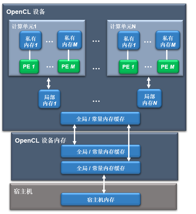 OpenCL内存模型与实际存储器体系结构无关,它定义了被内核所用的抽象内存体系,无需考虑实际的底层内存架构。内存模型分为四种类型:全局内存、常量内存、局部内存和私有内存;