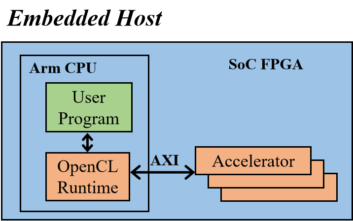 另一种是 利用 SoC FPGA,这种 SoC FPGA 分为 HPS 和 FPGA部分,其中 HPS 部分包含了 Arm 处理器,那主机程序运行在 Arm 处理器上,内核程序运行在 FPGA 上;他们两者之间通过 AXI 桥进行数据传输。