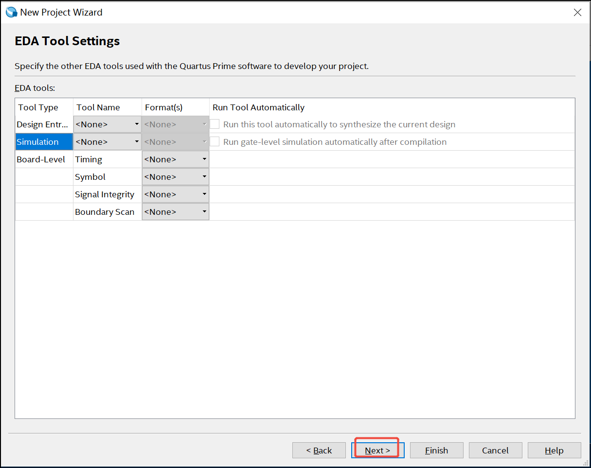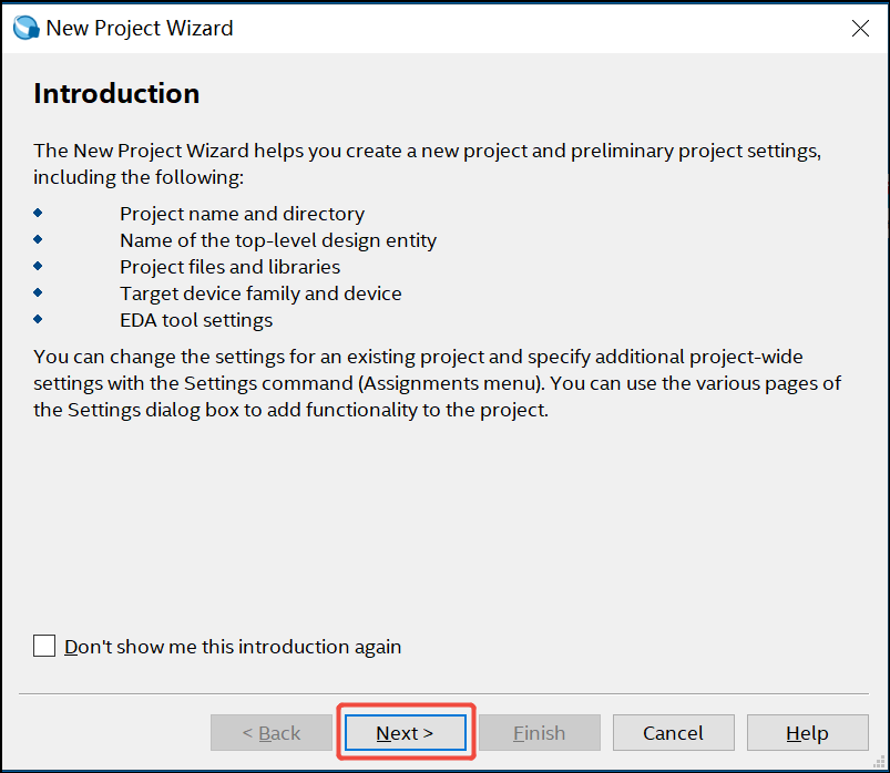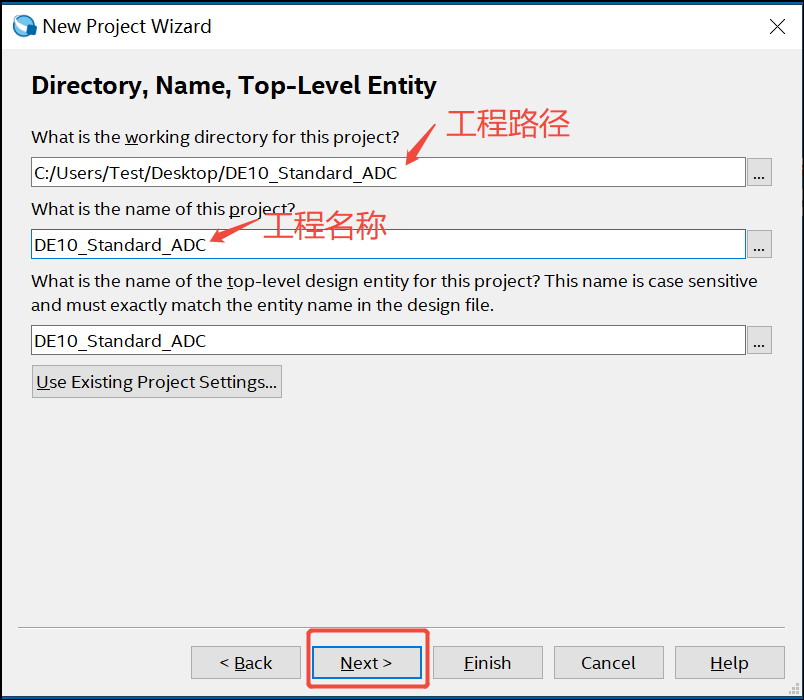 5. 设置工程路径,指定到你刚才创建的DE10_Standard_ADC文件夹下,然后给工程命名DE10_Standard_ADC, 点击Next: