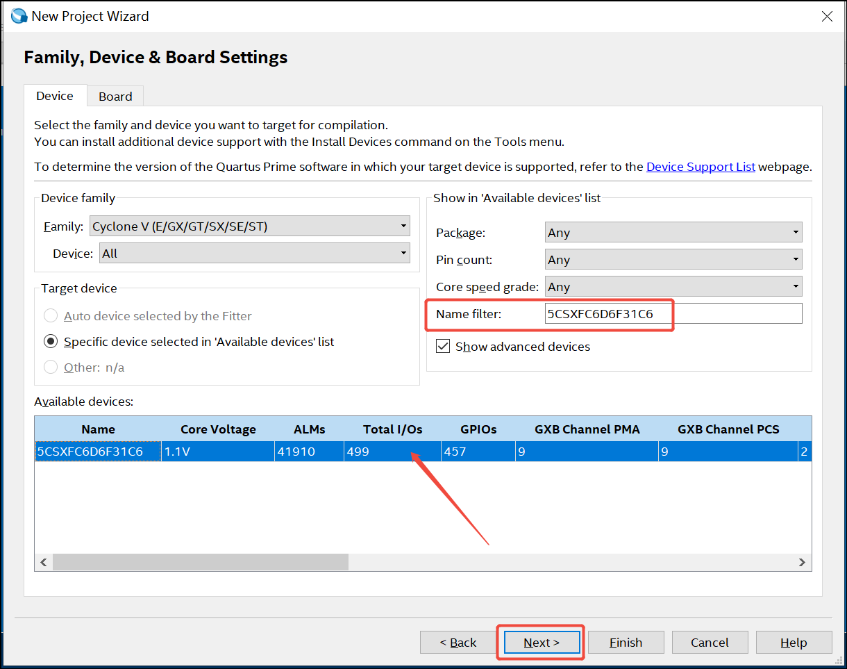 7. 在Name Filter处键入你的开发板对应的FPGA器件型号,从而在Avaliable devices窗口筛选出你要的器件(比如DE10-Standard开发板对应的FPGA 器件是5CSXFC6D6F31C6),点击该器件,然后点击Next:
