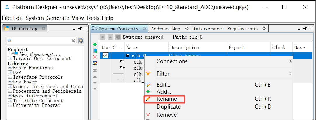 13. 右击clk_0组件,选择Rename,将组件clk_0命名为clk_50: