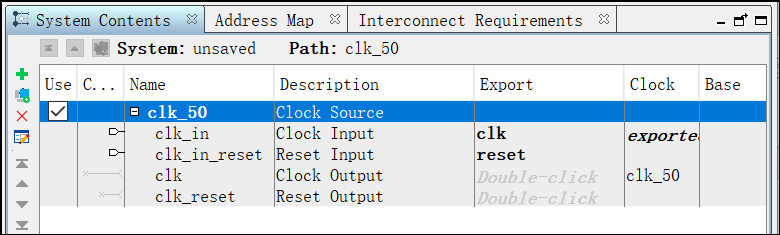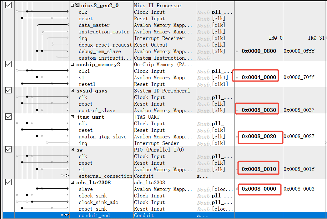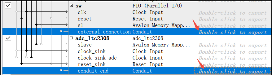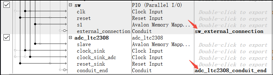 34. 双击pio 模块conduit_end端口对应的Export列(上面显示Double-click to export)将该端口导出(双击后显示pio_external_connection),同样的,双击adc_ltc2308模块conduit_end端口对应的Export列将其端口导出(双击后显示adc_ltc2308_conduit_end):