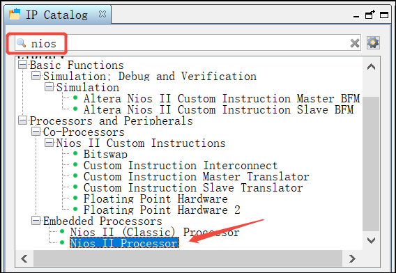 16. 在IP Catalog处键入nios 搜索找到Nios II Processor,双击打开它的配置界面: